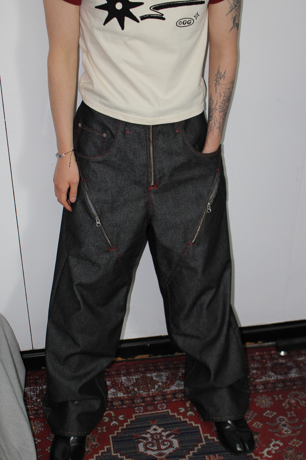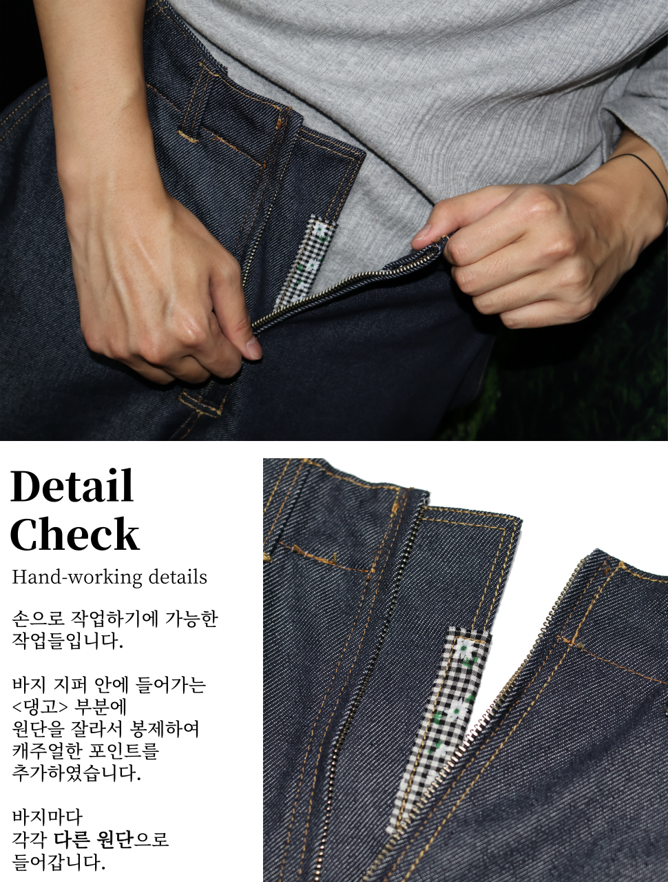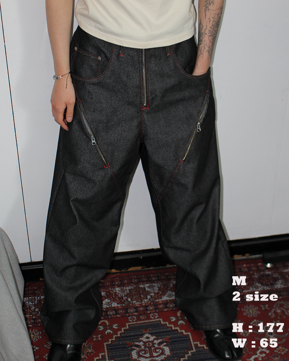 - 논페이드 흑청 데님과 레드 스티치의 조화가 매력이며, 전면 YKK 지퍼 라인 디테일이 담긴 팬츠입니다,