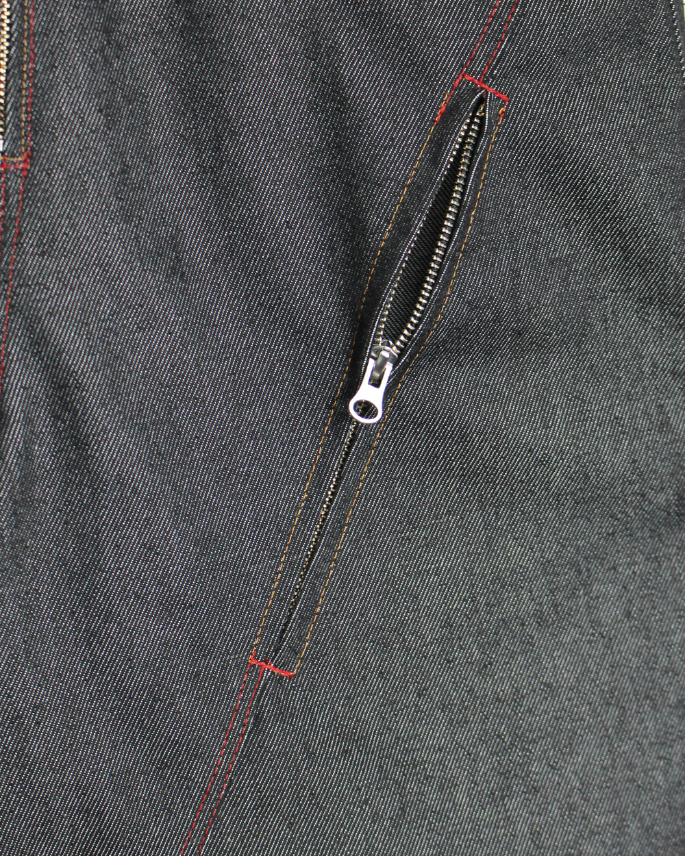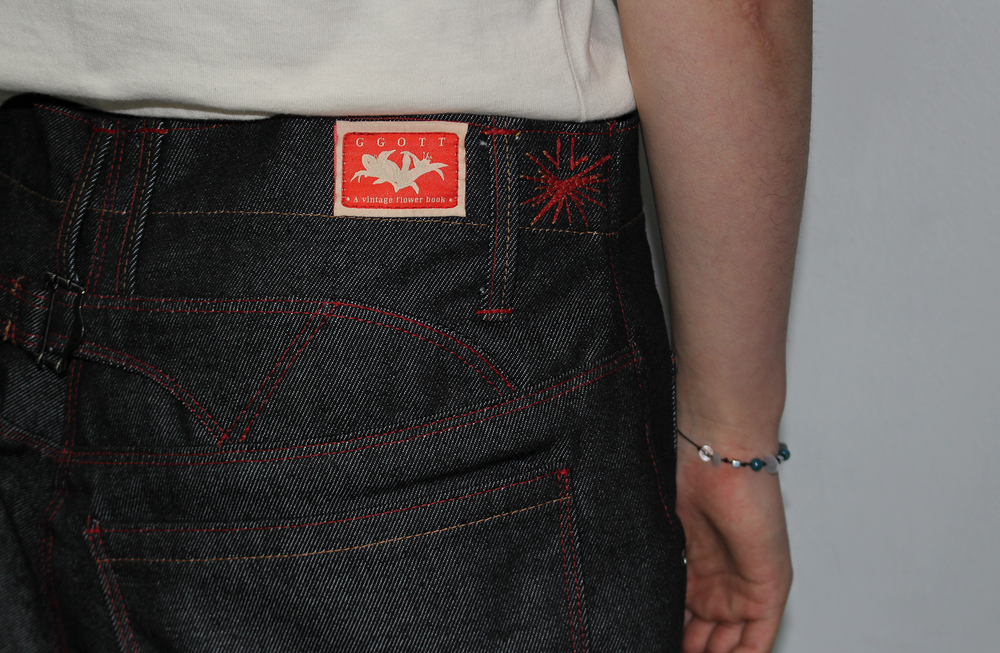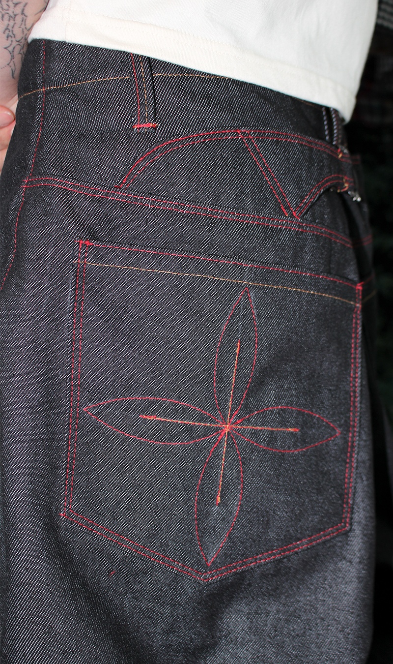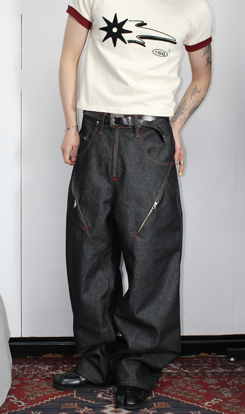- 논페이드 흑청 데님과 레드 스티치의 조화가 매력이며, 전면 YKK 지퍼 라인 디테일이 담긴 팬츠입니다,