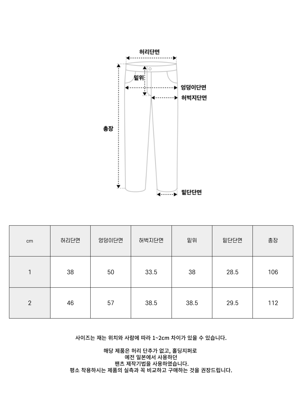 1 Size : 허리 38, 엉덩이단면 50, 허벅지단면 33.5, 밑위 38, 밑단단면 28.5 , 총장 106