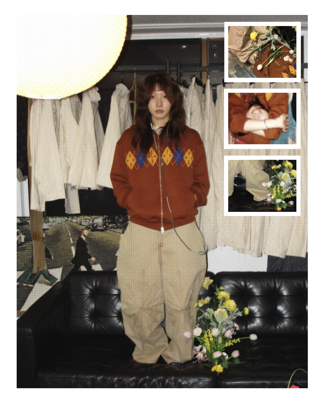 부클 아가일 니트 후드집업 번트 오렌지