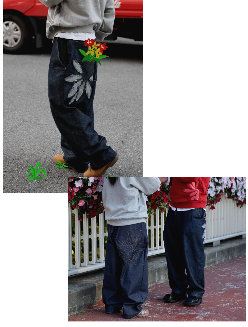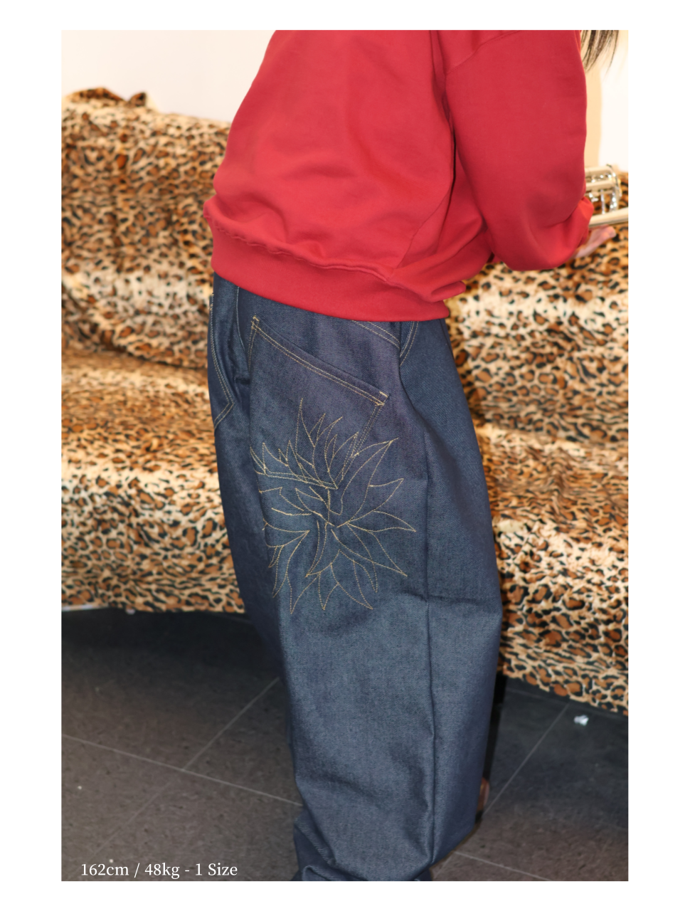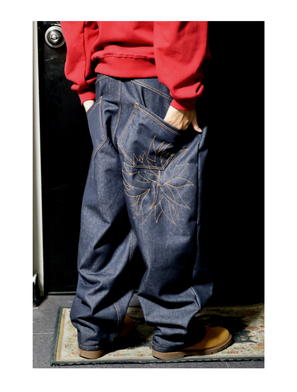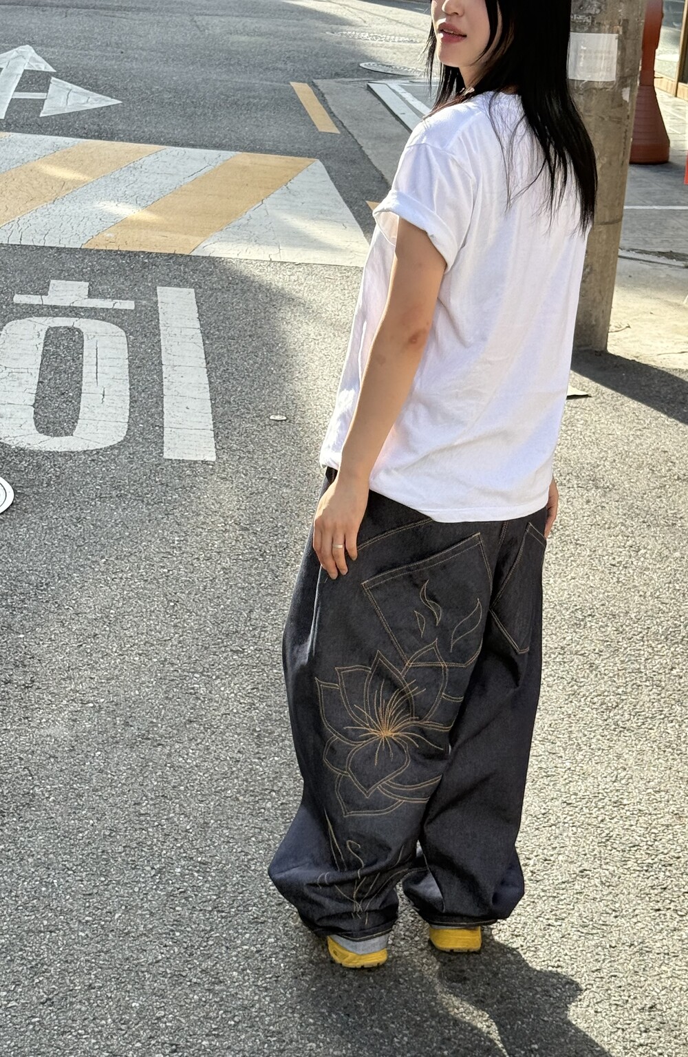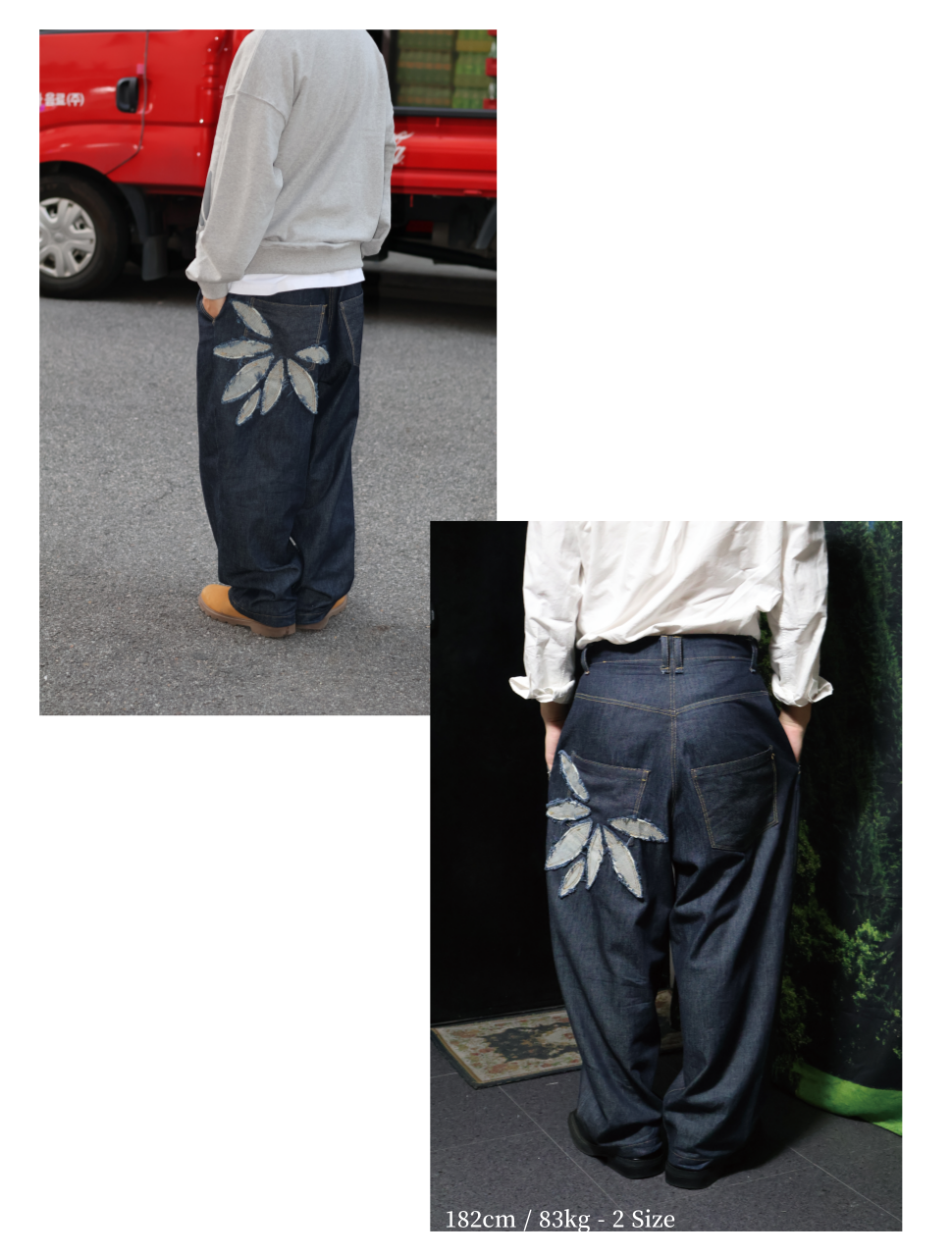 [Hand-Made「001」] Non-fade Wide Denim Pants [Flower series]
