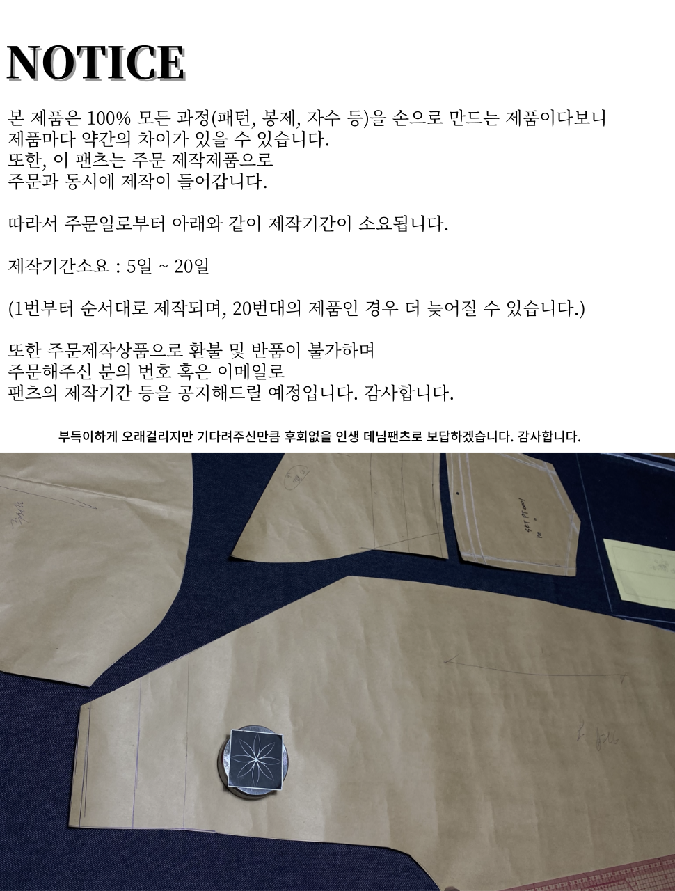 (주문제작 상품 특성상 환불 및 반품이 불가하며 주문해주신 분의 번호 혹은 이메일로 팬츠의 제작기간 등을 공지해드릴 예정입니다. 감사합니다.)