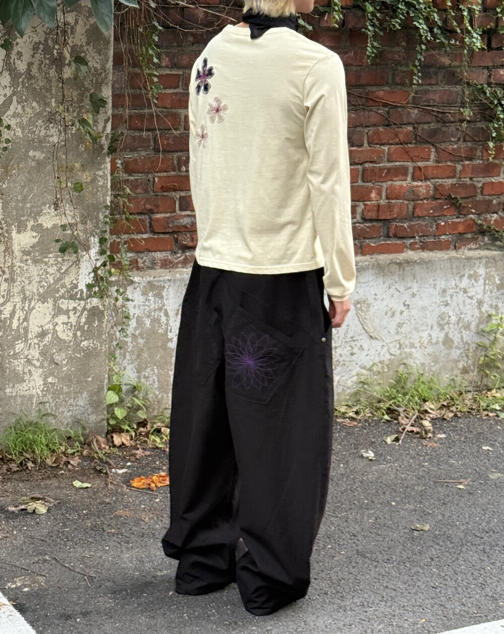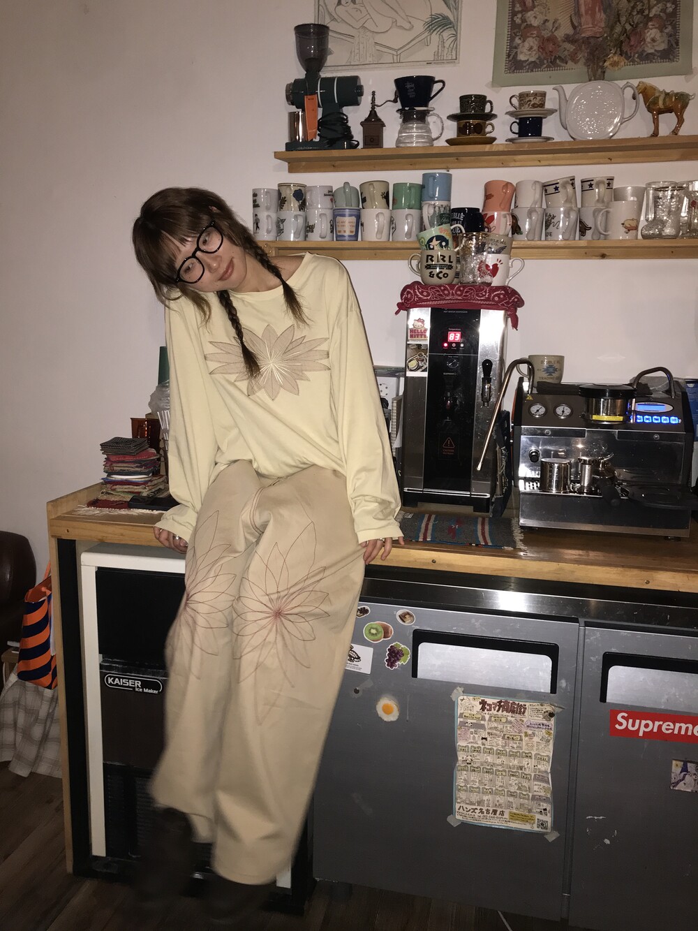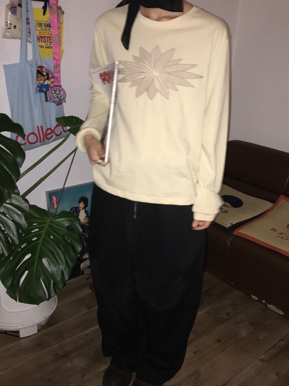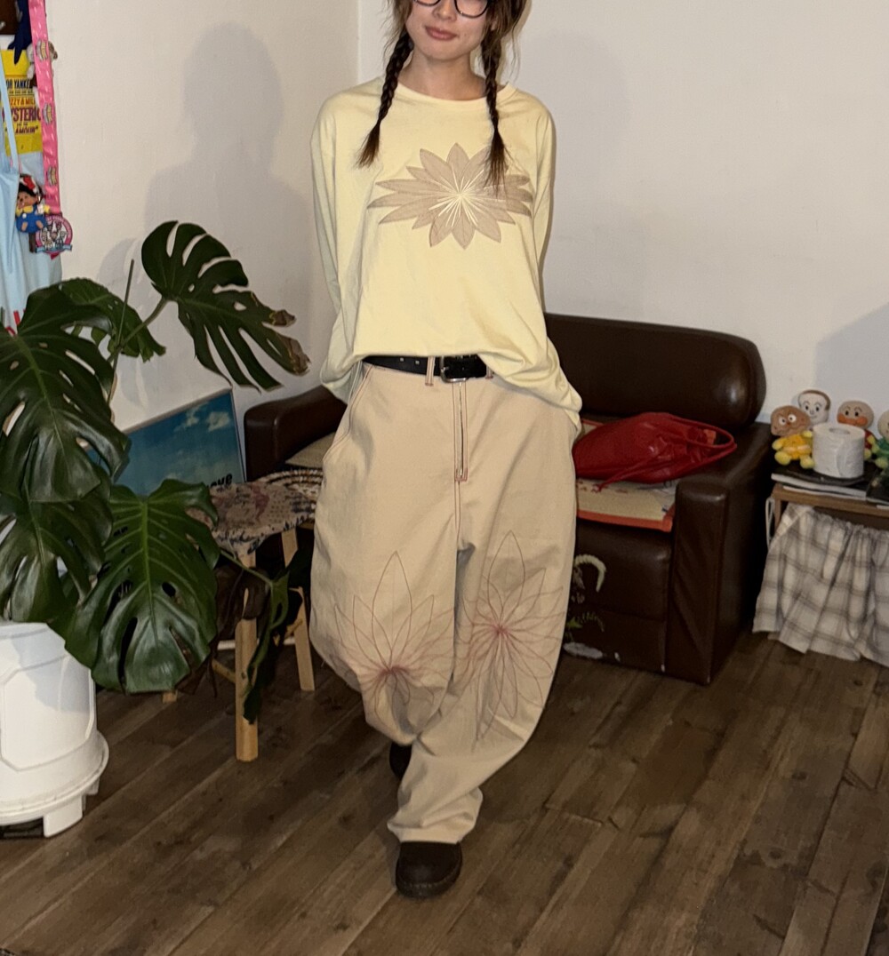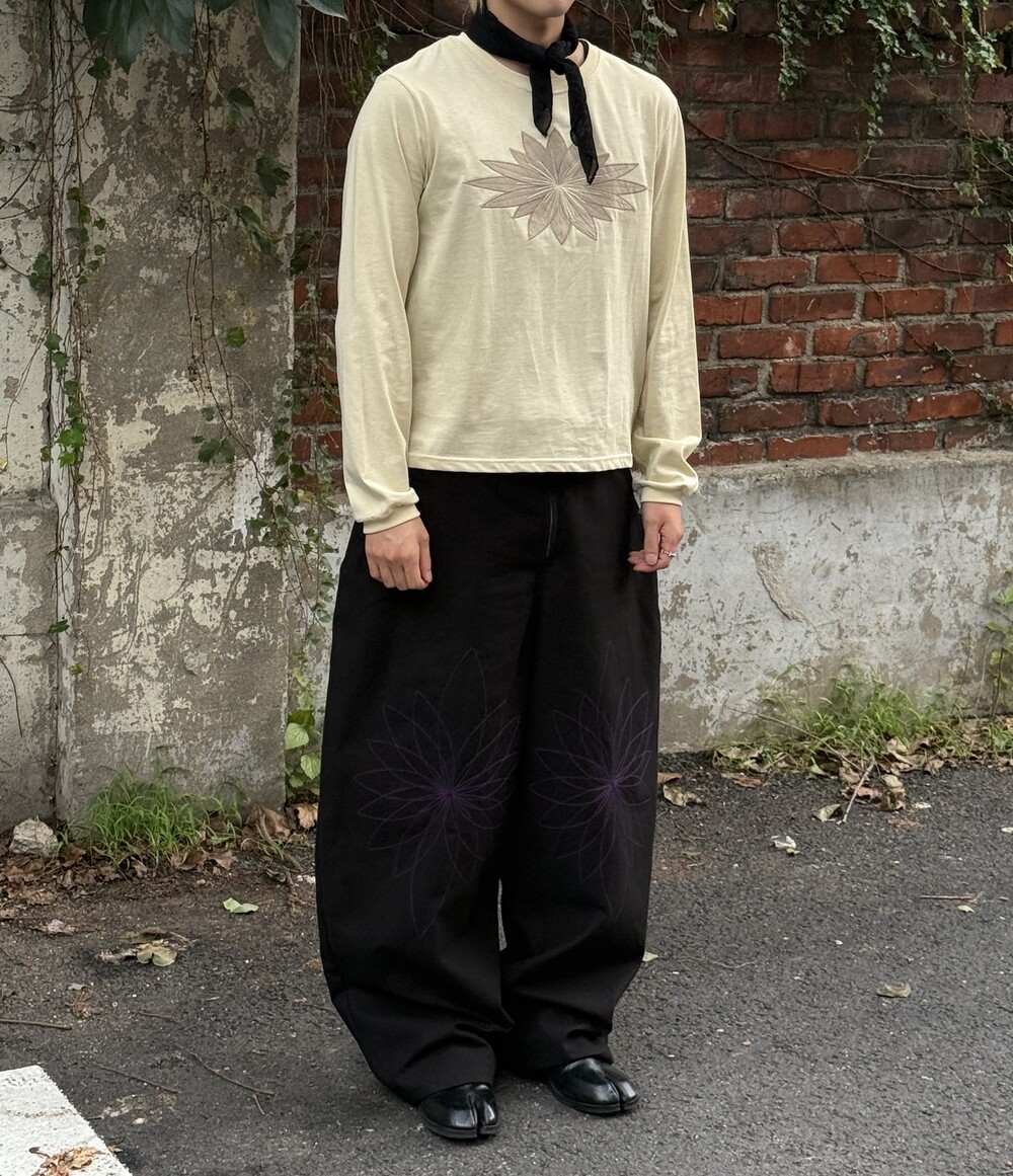 1사이즈는 여성과 남성 모두 착용 가능한 핏으로, 레귤러 핏에 크롭 기장으로 연출할 수 있습니다.