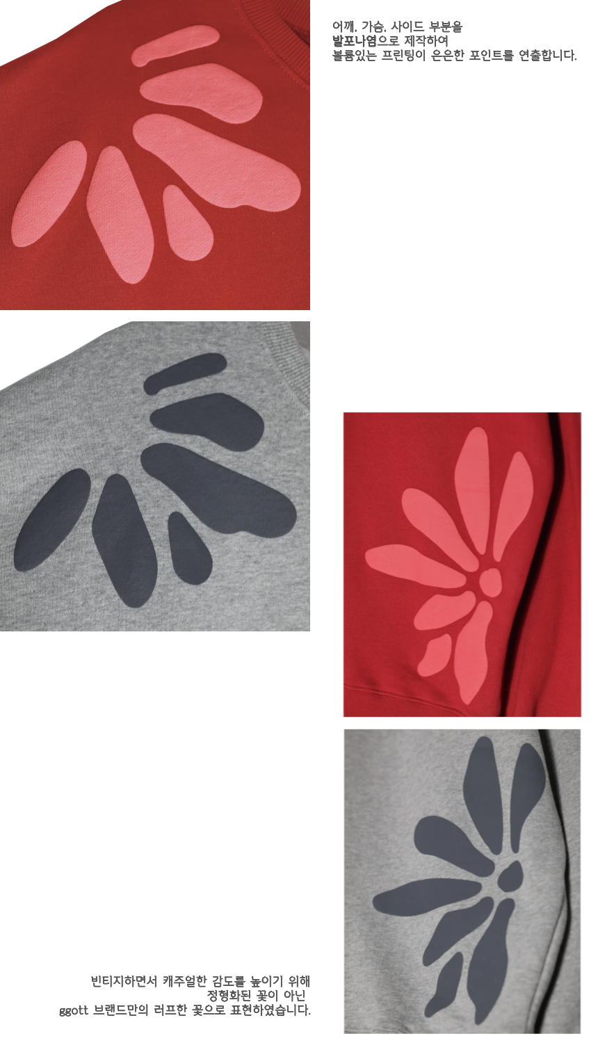 - 기존 프린팅 기법이 아닌, [발포나염] 기법을 활용해 제작하여 프린팅의 볼륨을 더욱 쌓았습니다.