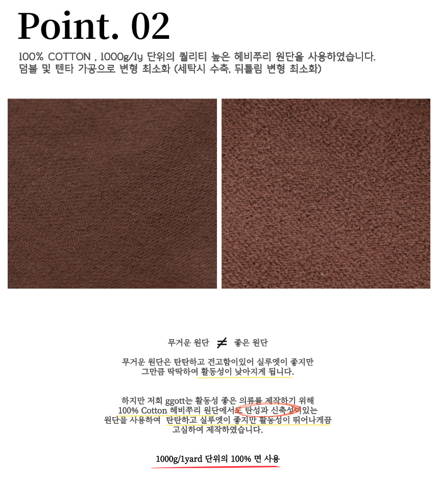 1000g/1y 이상의 고중량 헤비쭈리 원단을 사용하여 퀄리티 높은 실루엣을 연출합니다.