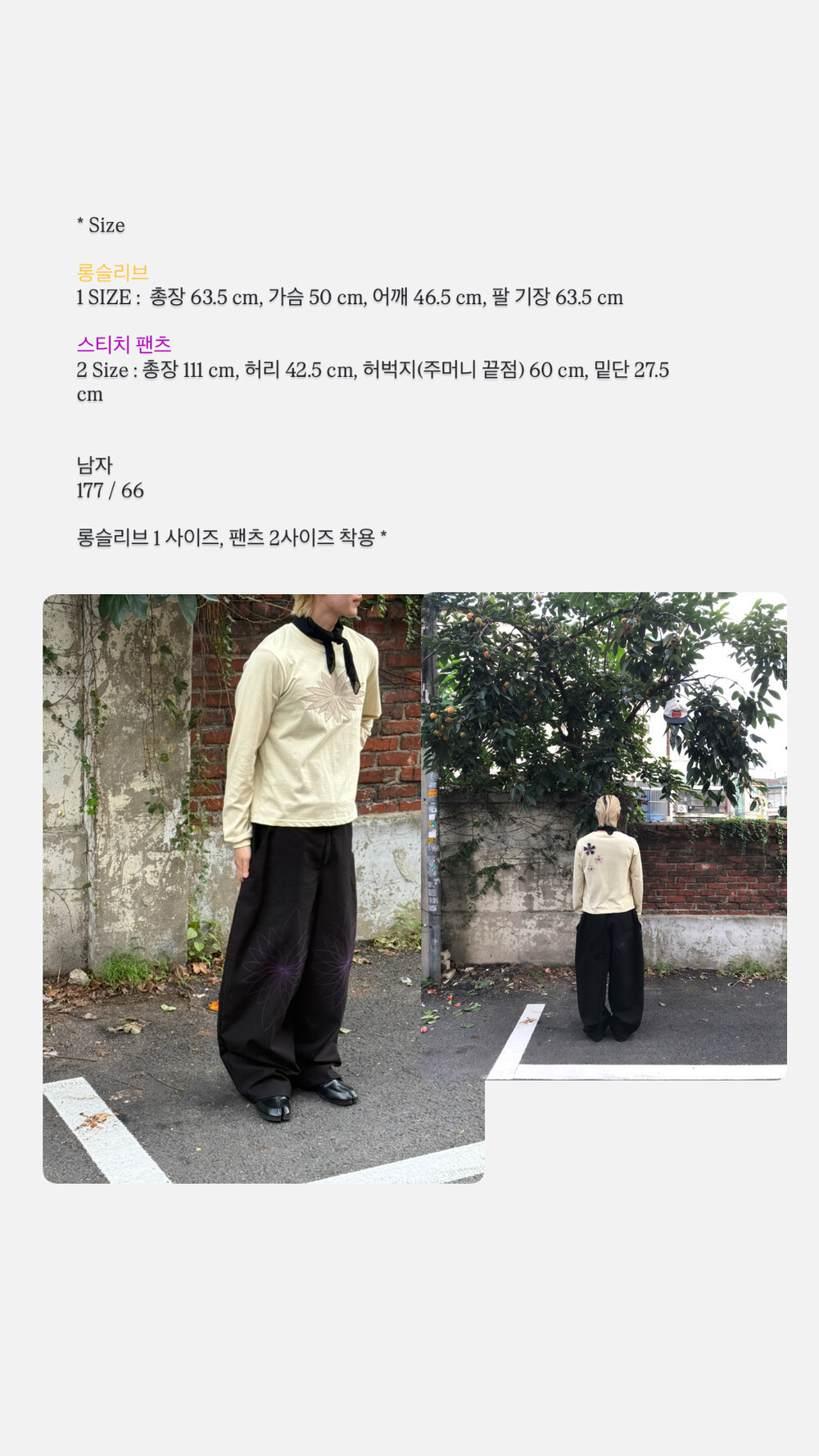총 3사이즈로 제작되었으며,전체적으로 와이드한 실루엣에 밸런스 있는 베기핏으로 동일하게 구성되었습니다.