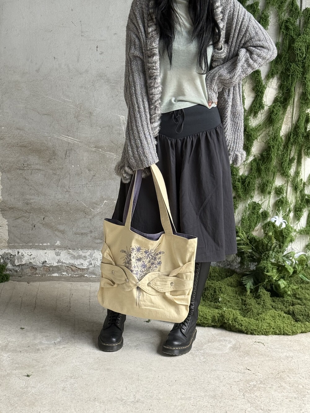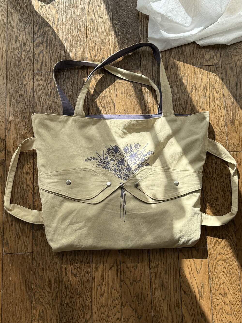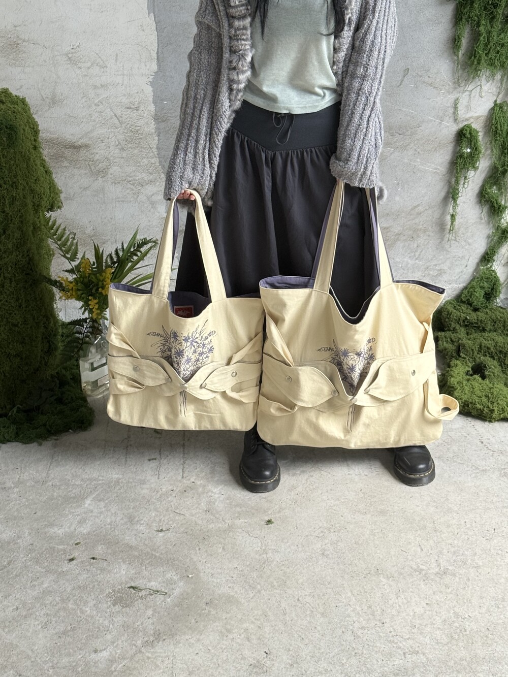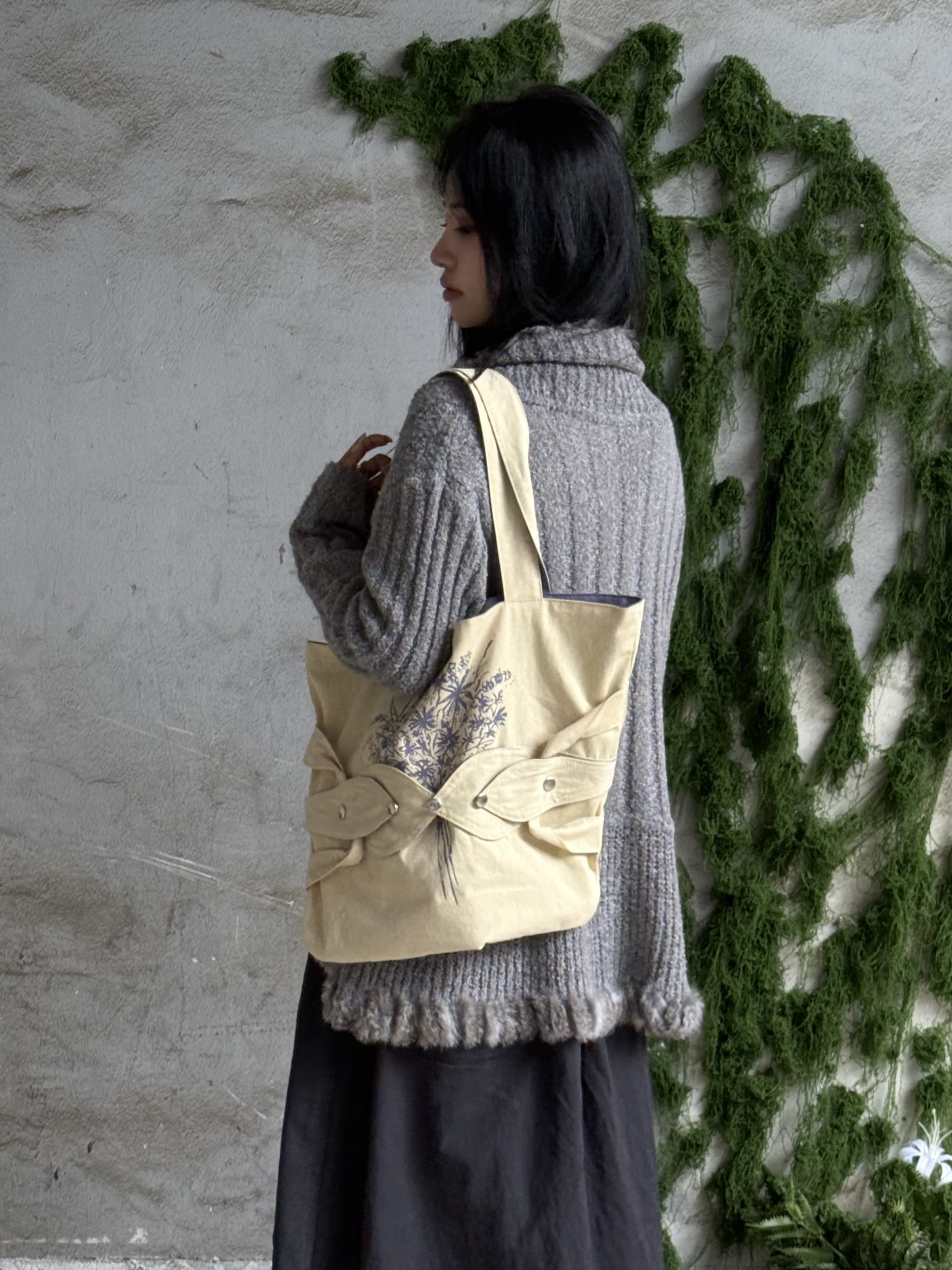 꽃다발 가방은 겉감과 안감의 색 조합이 특징이며, 겉에 덮개 및 꽃다발 나염 디자인이 포인트입니다.