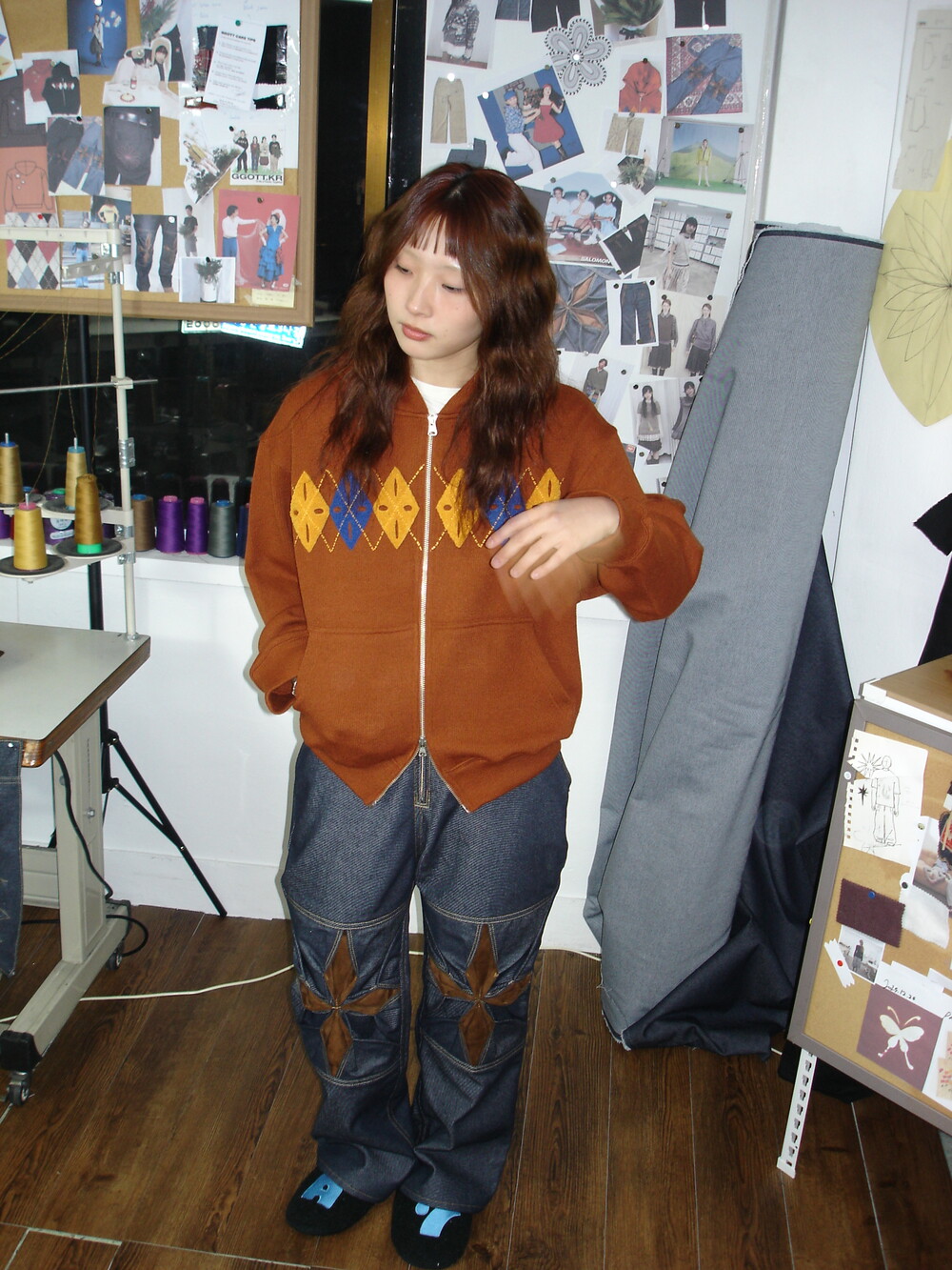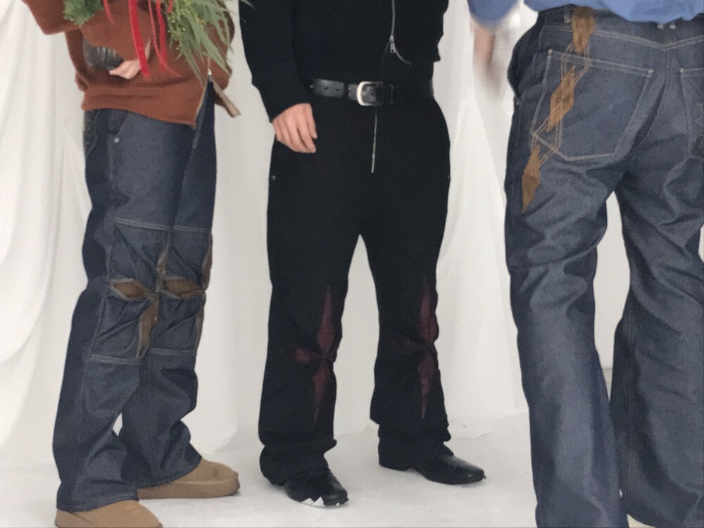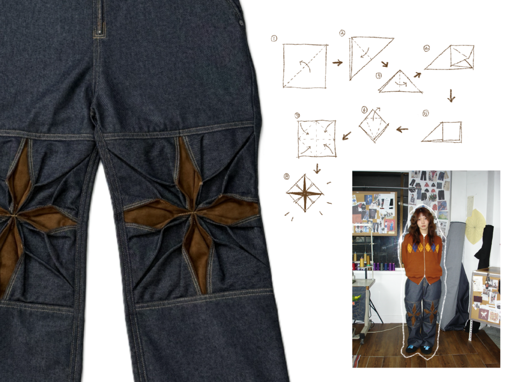 - 탄탄한 논페이드 데님 원단으로 제작함과 동시에 무릎 오리가미 기법에 스웨이드 원단을 활용하였습니다.