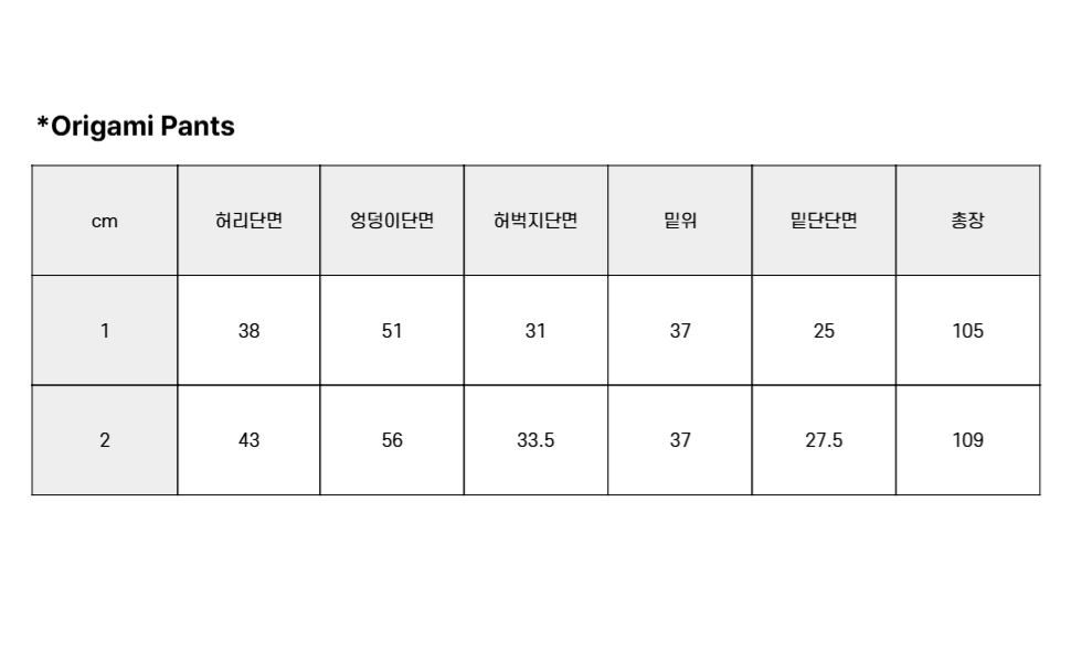 1 Size : 허리 38, 엉덩이단면 51, 허벅지단면 31, 밑위 37, 밑단단면 25 , 총장 105